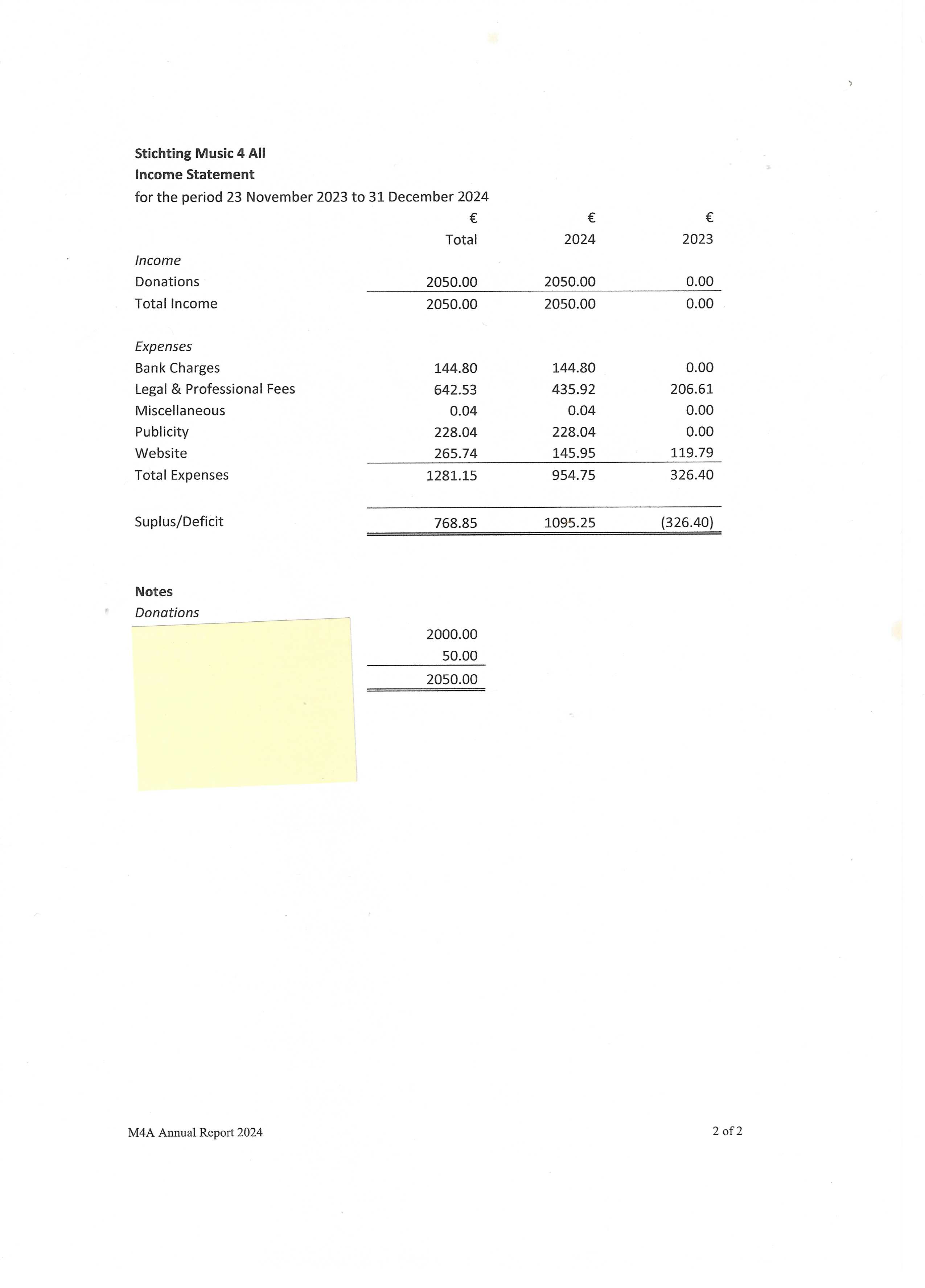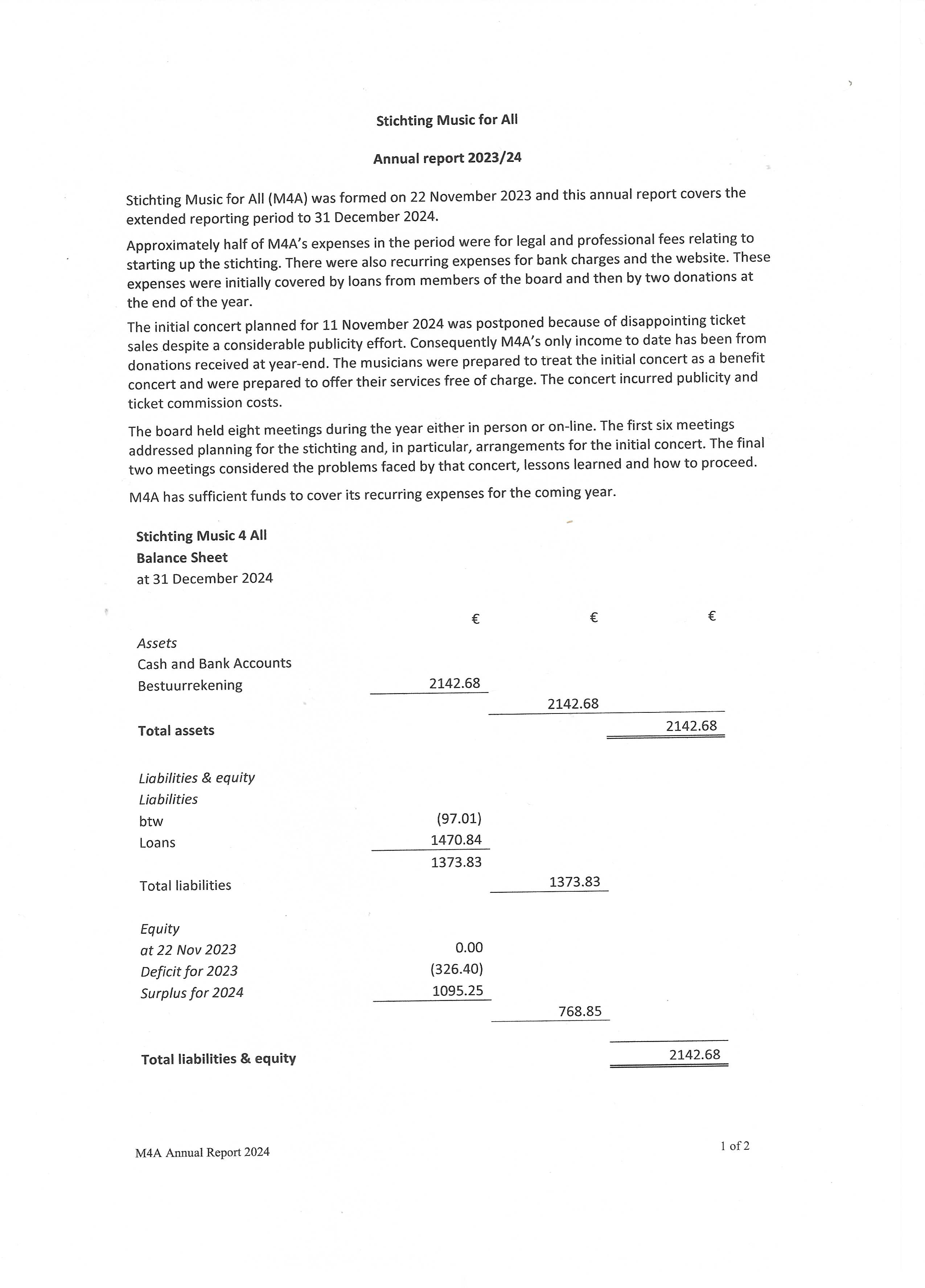 De stichting M4A is opgericht op 22 november 2023. Het eerste (lange) boekjaar van de stichting eindigt op 31 december 2024. Inmiddels is het eerste financiële verslag van M4A onlangs vastgesteld door het bestuur van de Stichting. Dankzij een tweetal donateurs beschikt de Stichting over voldoende middelen om in het jaar 2025 aan al haar terugkerende verplichtingen te kunnen voldoen. Het financieel verslag omvat 2 pagina's (zie beide bijlagen).